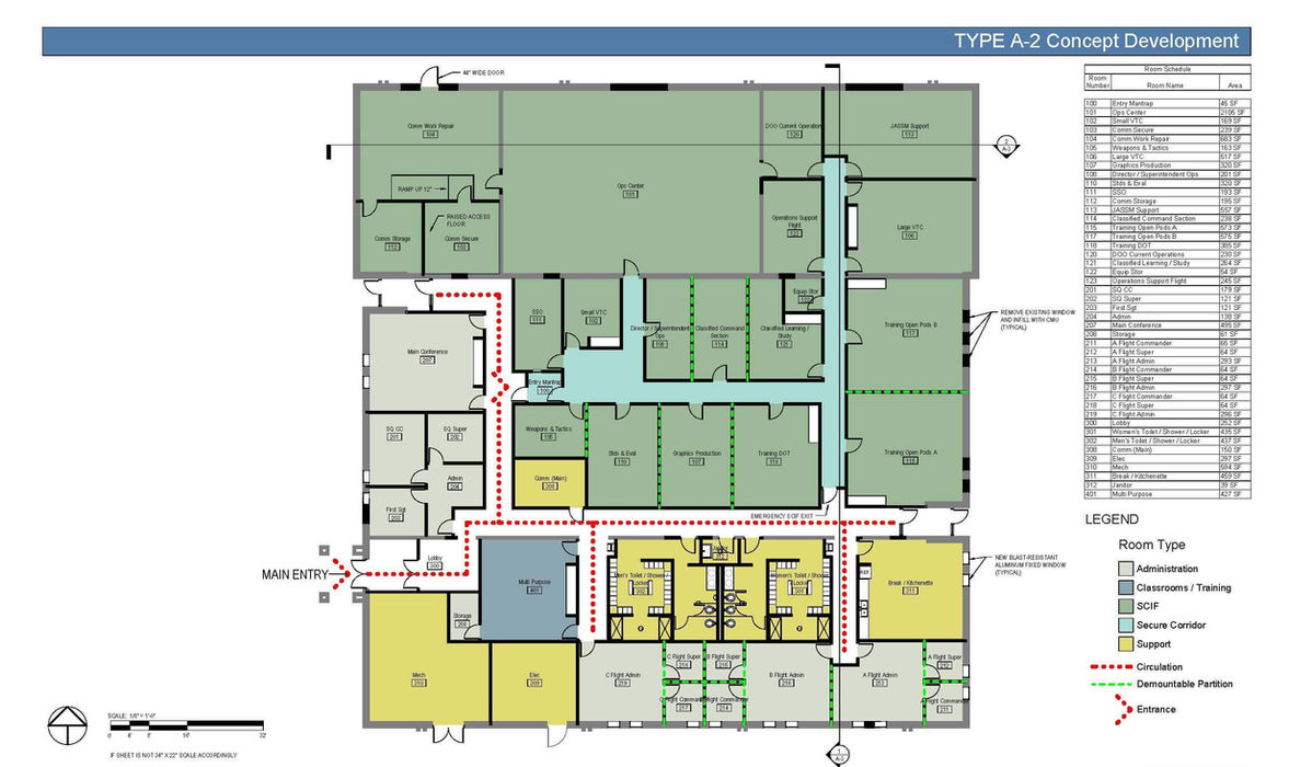 The renovation of the Target Intelligence Building fully transforms an administration facility into a large classified TS level secure compartmented information facility.